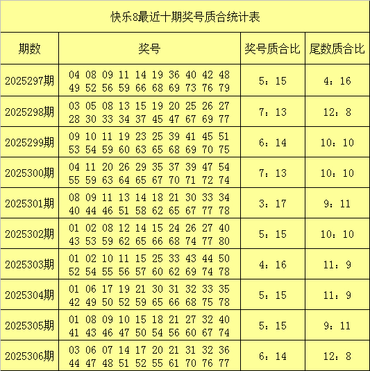 福彩快乐8第2025306期开出奖号:03 06 07 14 17 20 21 31 32 36 44 47 48 51 52 55 61 70 76 77,其中奖号质合比为6:14,奖号尾数质合比为12:8。